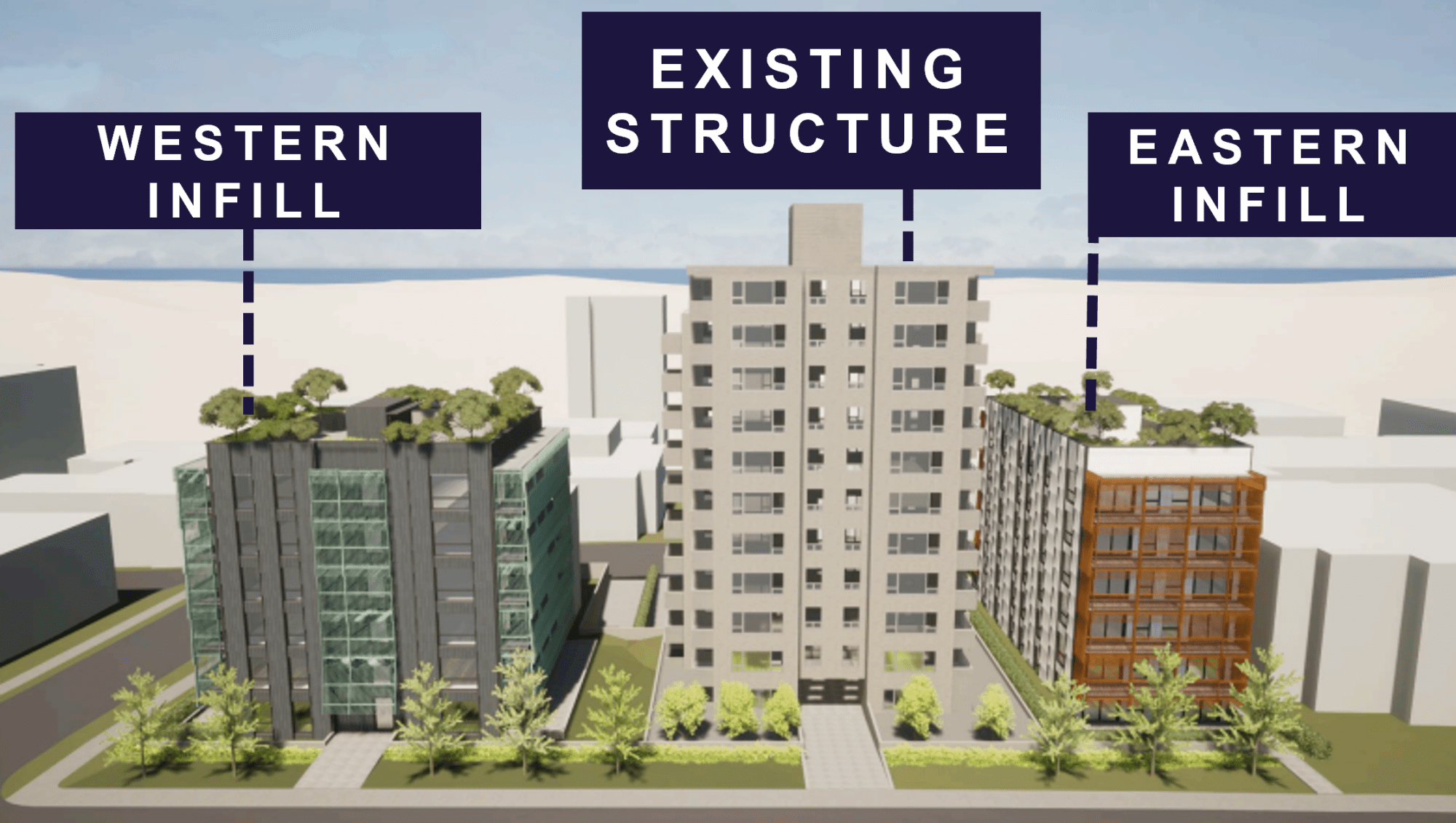 - Immediate wood-frame infill development opportunity allowing for an estimated ~39,000 square feet of buildable area on the excess land to the west and east of the existing rental tower.